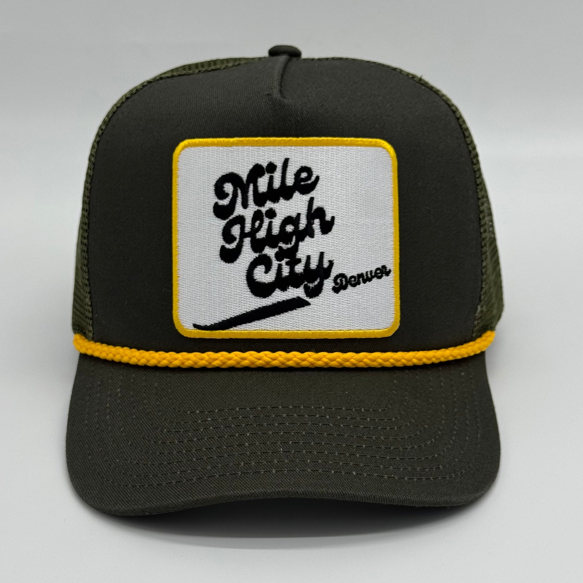 Olive green twill snapback trucker with "Mile High City" patch.